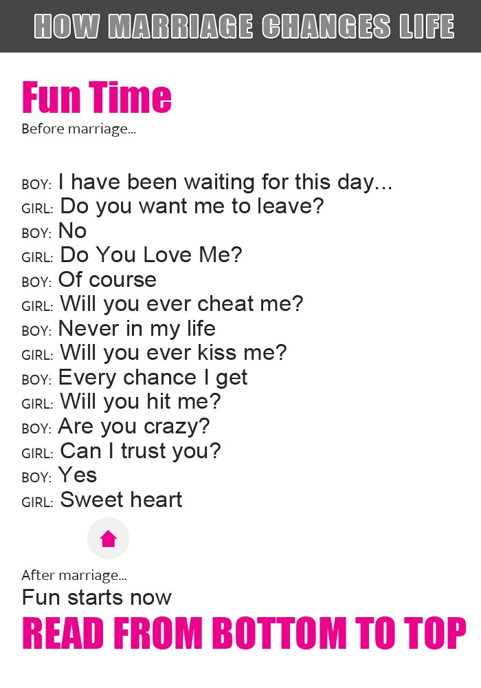 "How Marriage Changes Life. Fun Time. Before marriage... BOY: I have been waiting for this day... GIRL: Do you want me to leave? BOY: No GIRL: Do You Love Me? BOY: Of course GIRL: Will you ever cheat me? BOY: Never in my life GIRL: Will you ever kiss me? BOY: Every chance I get GIRL: Will you hit me? BOY: Are you crazy? GIRL: Can I trust you? BOY: Yes GIRL: Sweet heart. After marriage... Fun starts now READ FROM BOTTOM TO TOP" Funny reverse dialogue that tells totally opposite opinion. Funny! :D